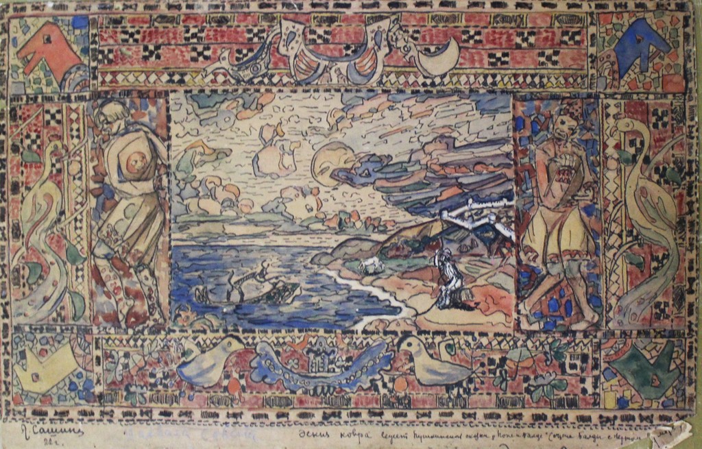 Эскиз ковра "Сюжет пушкинской сказки о попе и работнике его Балде. Сцена Балды с чёртом у моря".