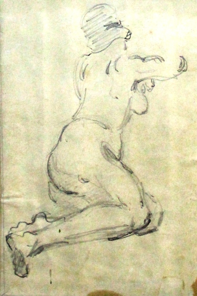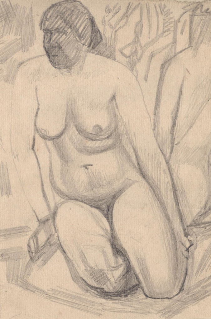 Обнажённая, стоящая на коленях.