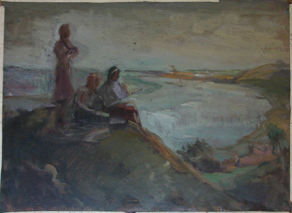 На обороте: этюд с изображением трех девушек, сидящих на кургане.