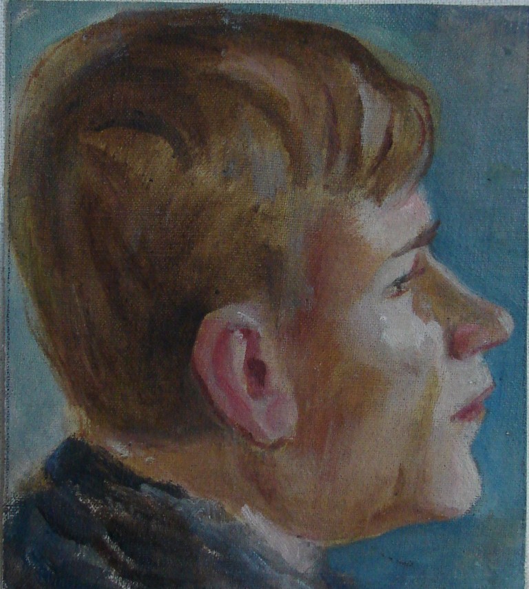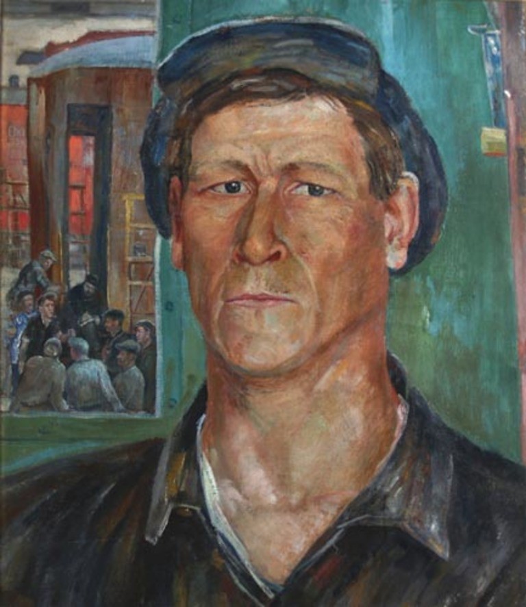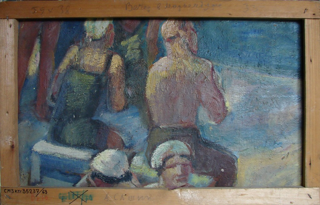 - на обороте этикетка с надписью: "Сашин. Бригадир Лечицкий (Кр(асный) Путил(овец)) с выст(авки) Лен(инградского) Обл(астного) Дом(а) Худ(ожников)". За планку подрамника была вложена записка с надписью: "Тов(арищ) Лечицкий, бригадир лучшей(?) из расчетной бригады ..."Красного Путиловца" А.Сашин". Публикация: Каталог выставки портрета. Ленобластной Рабис. Ленинградский Областной Дом Художника. Март 1933. Лечицкий Станислав Альбинович(1898-1937). Родился в 1898 г., уроженец и житель г. Ленинград, поляк, беспартийный, рабочий Кировского завода. Арестован 21 августа 1937 г. Комиссией НКВД и Прокуратуры СССР 9 сентября 1937 г. приговорен по ст. ст. 58-1а-9-11 УК РСФСР к высшей мере наказания. Расстрелян в г. Ленинград 28 сентября 1937 г. Источник: Ленинградский мартиролог, том 1.